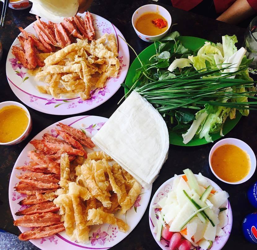 Bánh tráng nướng làm từ bánh tráng đập thêm trứng gà, phô mai, pate gan, bò khô, mayonaise lên trên. Bánh nướng bếp than hồng thơm phức và nóng hổi. Chỉ vài phút là có một đĩa bánh đã cắt miếng ăn kèm tương ớt.
